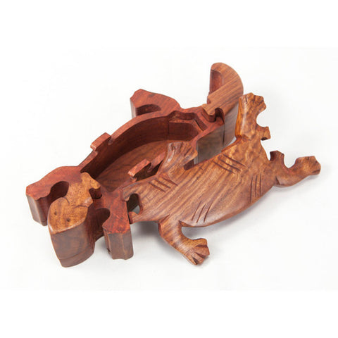 This gecko is a fun, 3D puzzle made of shesham wood. This engaging, unique puzzle was hand-carved by talented artisans and has a hidden space inside. Measures 8 by 4 inches
