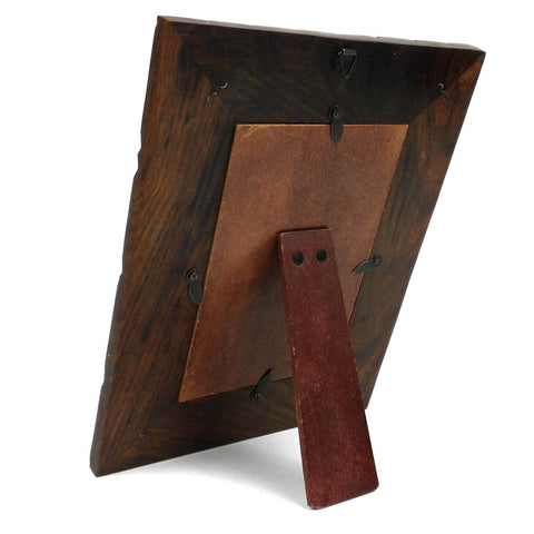 This hand carved 8 by 10 inch Indian Rosewood frame with glass opening is intricately carved with a diamond design. Easy to use hinges for removing the back and a wooden easel stand for standing. Frame holds 4x6 inch photo.
