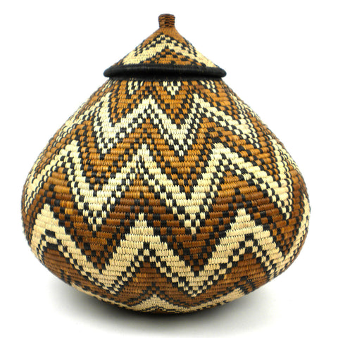 This basket is a one of a kind, you will get the basket pictured. The height is 16 inches and the circumference measures 51 inches. Each basket comes with an information card describing the meaning of the designs. This "Ukhamba" or beer basket is a bulb-shaped basket with a lid traditionally used to store the local brew. They are given as wedding gifts as the designs have specific meaning. You can research the meaning of the design from the product tag image. Handmade in South Africa by Ilala Weavers.